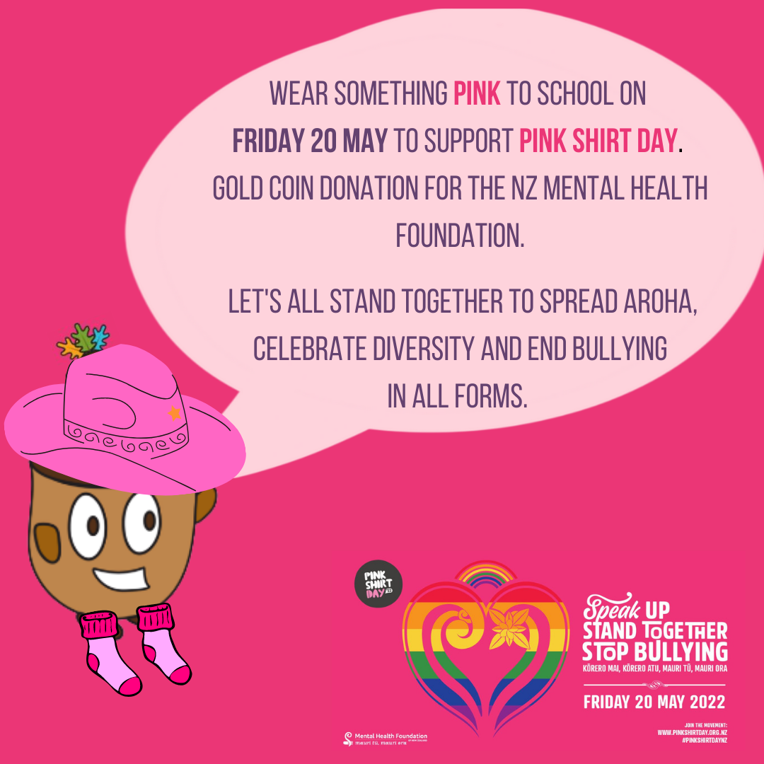 Reminder that tamariki can wear something pink to school tomorrow to support Pink Shirt Day.